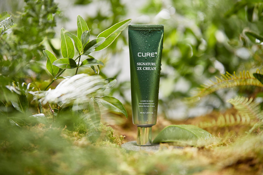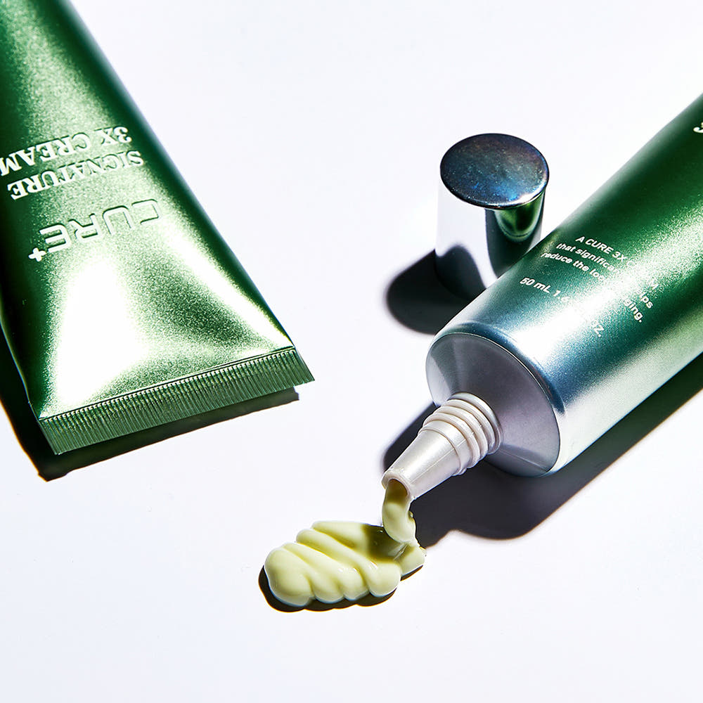 - During the cream application phase of your skincare routine, dispense an appropriate amount of Cure Signature 3X Cream.