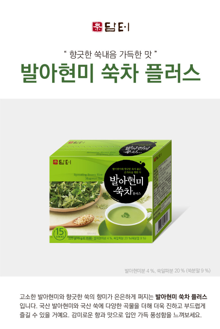 Experience the authentic taste of Korea with DAMTUH Sprouting Brown Rice Mugwort Tea Plus. This premium instant tea blend combines the wholesome goodness of sprouted brown rice with the traditional benefits of Korean mugwort (ssuk), creating a comforting and nutritious beverage perfect for any time of day.