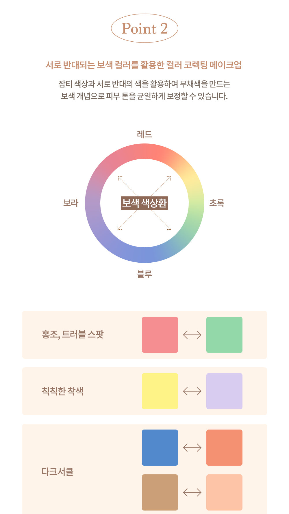 With the complementary color concept of creating achromatic colors using blemish colors and opposite colors, skin tone can be corrected uniformly.