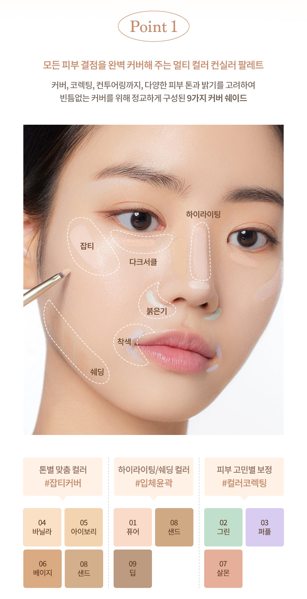 * A custom pro concealer palette that corrects all skin imperfections with 9 cover shades for various skin tones– Point 1