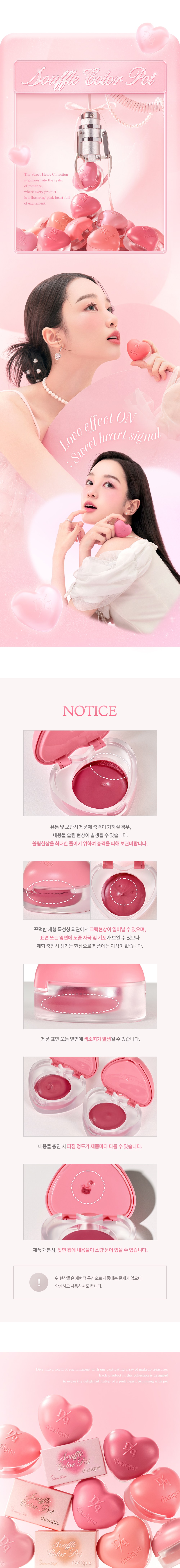 - Content Shifting: The product contents may shift slightly within the heart-shaped container if exposed to impacts during transit or storage. Please open your Souffle Color Pot gently to prevent any smearing on the lid, keeping your beautiful product pristine.