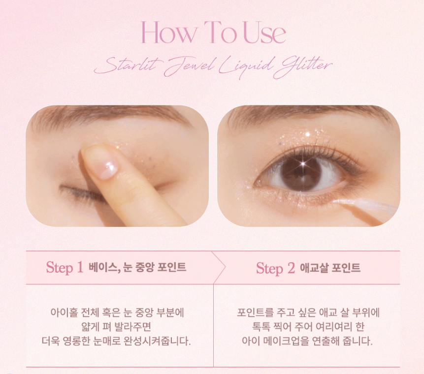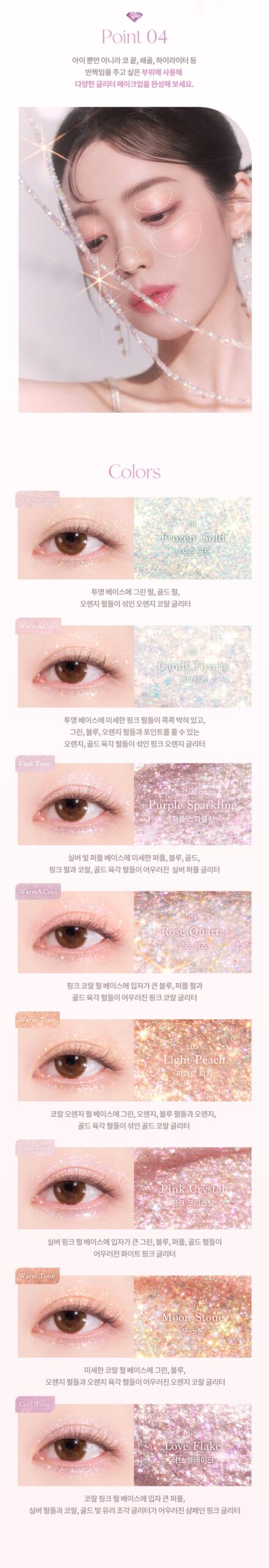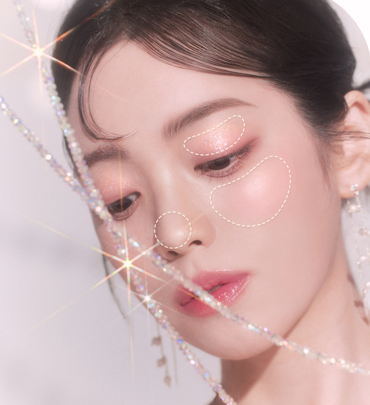 Complete a variety of glitter makeup by using it not only on your eyes, but also on areas you want to shine, such as the tip of your nose, collarbone, and eye lighter.