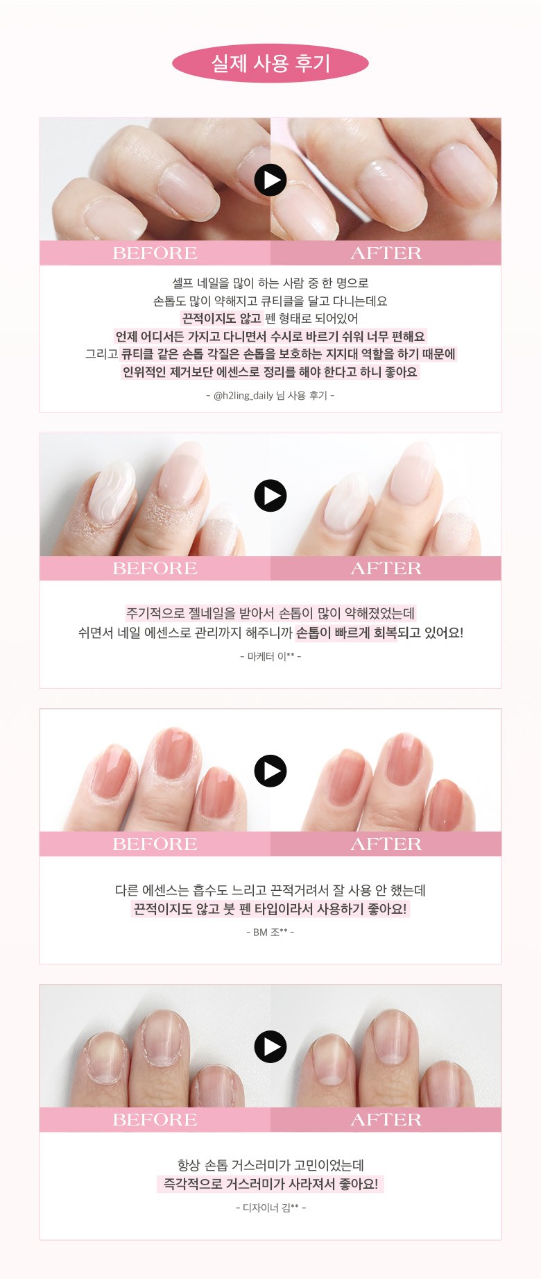 I used this nail essence for a week. My nails feel more hydrated and stronger now. Easy to apply, not sticky at all. I keep it in my bag.