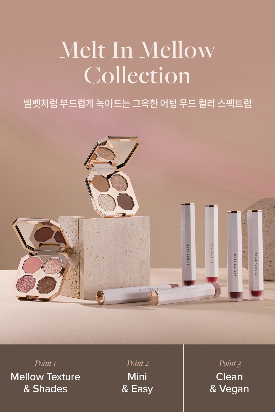 A wearable color combination with a highly pigmented texture that melts softly like velvet and a deep autumn mood.