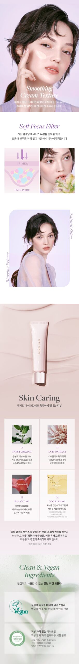 Moisturizing Ingredients: Enriched with glyceryl glucoside, this primer supports skin hydration and moisture retention. It also contains DEAR DAHLIA’s patented Dahlia Variabilis Flower Extract, known for its antioxidant properties, along with plant-derived oils that nourish and smooth the skin.