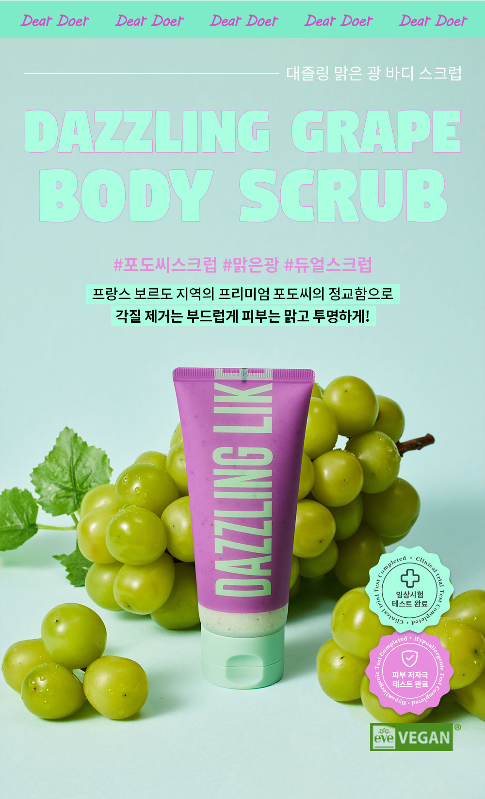 The Dear Doer Body Scrub is specially formulated to remove hardened keratin from pores and absorb excess sebum, which helps prevent whiteheads and leaves the skin clear and fresh. Clinical trials have demonstrated its effectiveness in improving overall skin texture and condition. The invigorating, refreshing scent revitalizes both body and mind, making each use a rejuvenating experience.