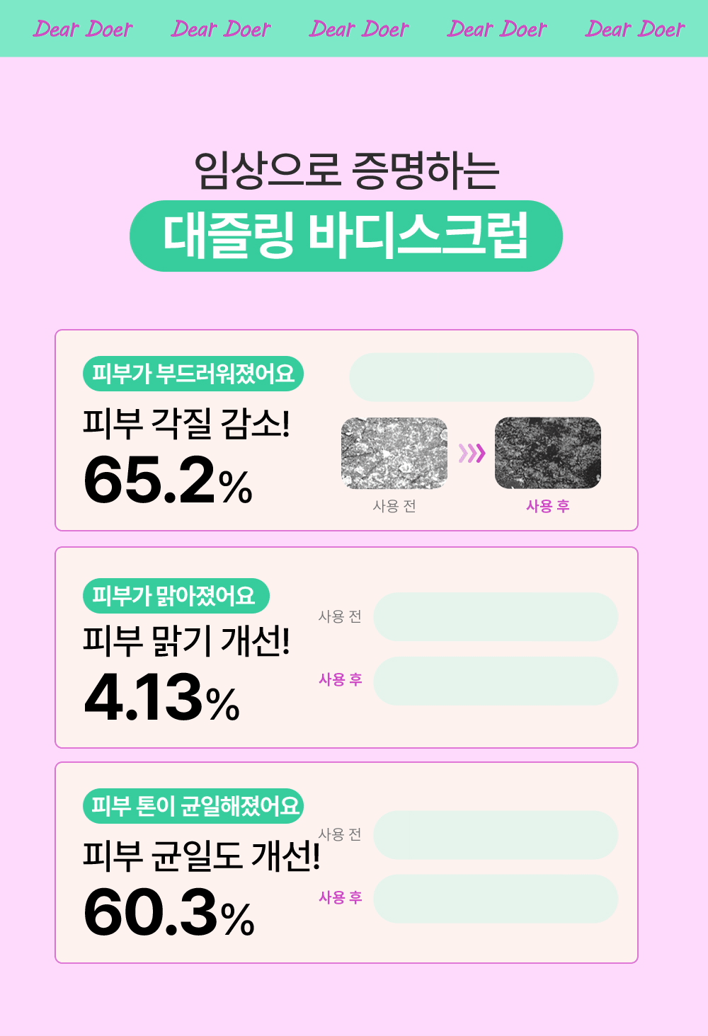 The Dear Doer Body Scrub is specially formulated to remove hardened keratin from pores and absorb excess sebum, which helps prevent whiteheads and leaves the skin clear and fresh. Clinical trials have demonstrated its effectiveness in improving overall skin texture and condition. The invigorating, refreshing scent revitalizes both body and mind, making each use a rejuvenating experience.