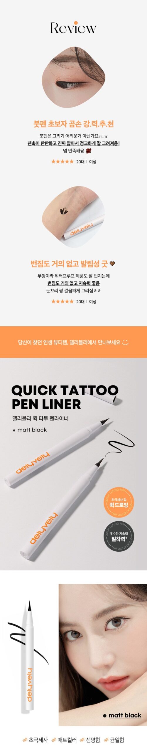 やっと探していたアイライナー見つけた!デリヴェリーのクイックタトゥーペン、すごく簡単に使えるから助かる〜。特に細いブラシが好きで、自分でもプロっぽい仕上がりになるんだよね。持続力もあるし、水にも強いから、仕事終わった後遊び行っても心配なし。一度試したら手放せなくなること間違いなしだからみんなにオススメするよ〜。