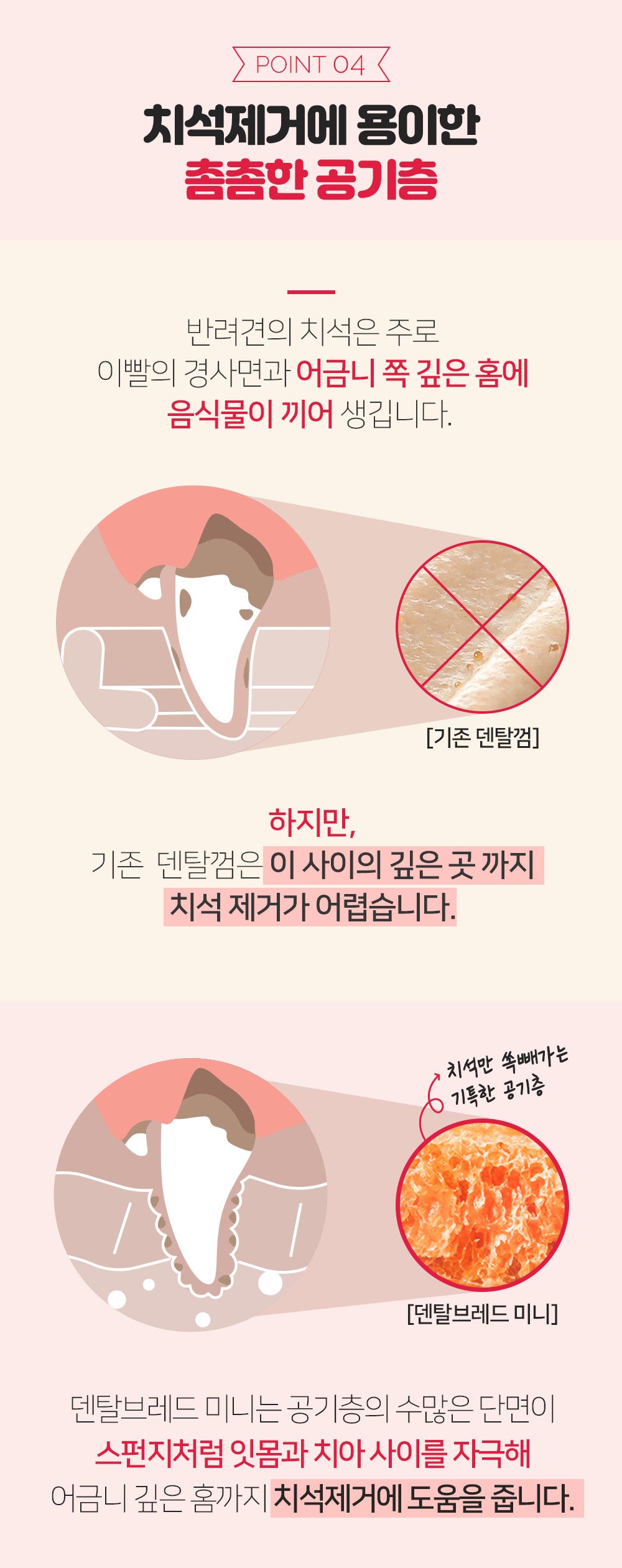 So, Dental Bread has a layer of air in the middle for easy tartar removal. Numerous sections of the air layer stimulate between the gums and teeth like a sponge, helping to remove tartar down to the deep grooves of the molars.