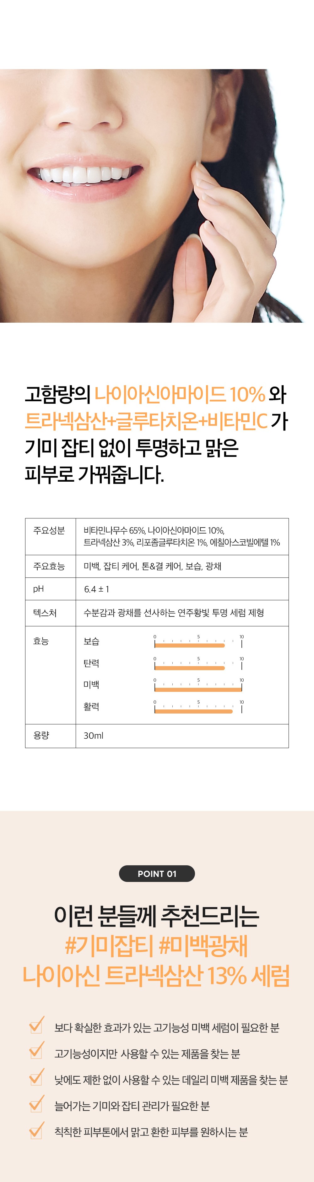 - Niacinamide 10%: Vitamin B3 for sebum control, pore care, and skin brightening