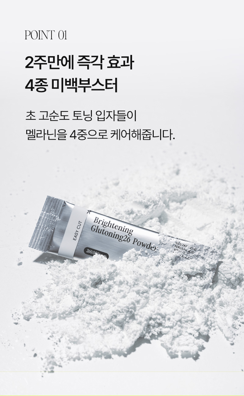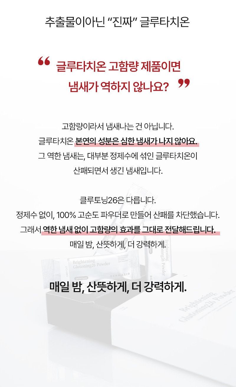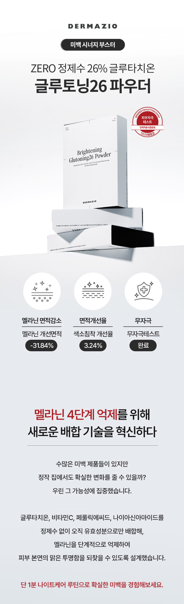 With consistent nighttime home care, DERMAZIO Glutoning 26 Powder helps suppress melanin production and restore natural skin radiance. Free from purified water and unnecessary additives, it blends only effective brightening ingredients: