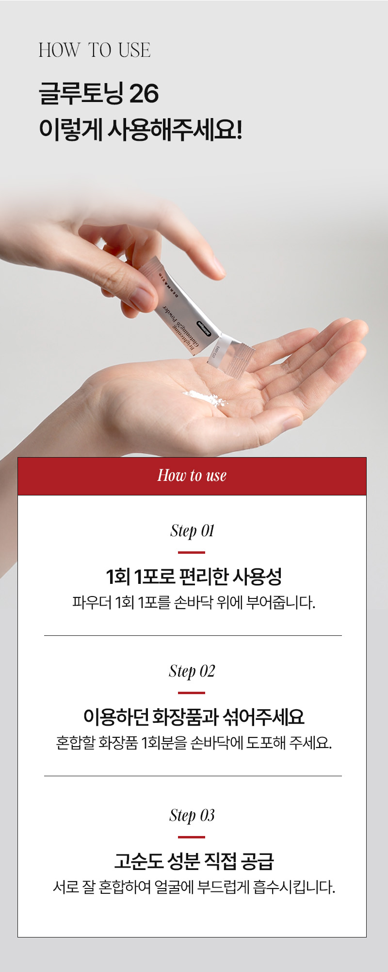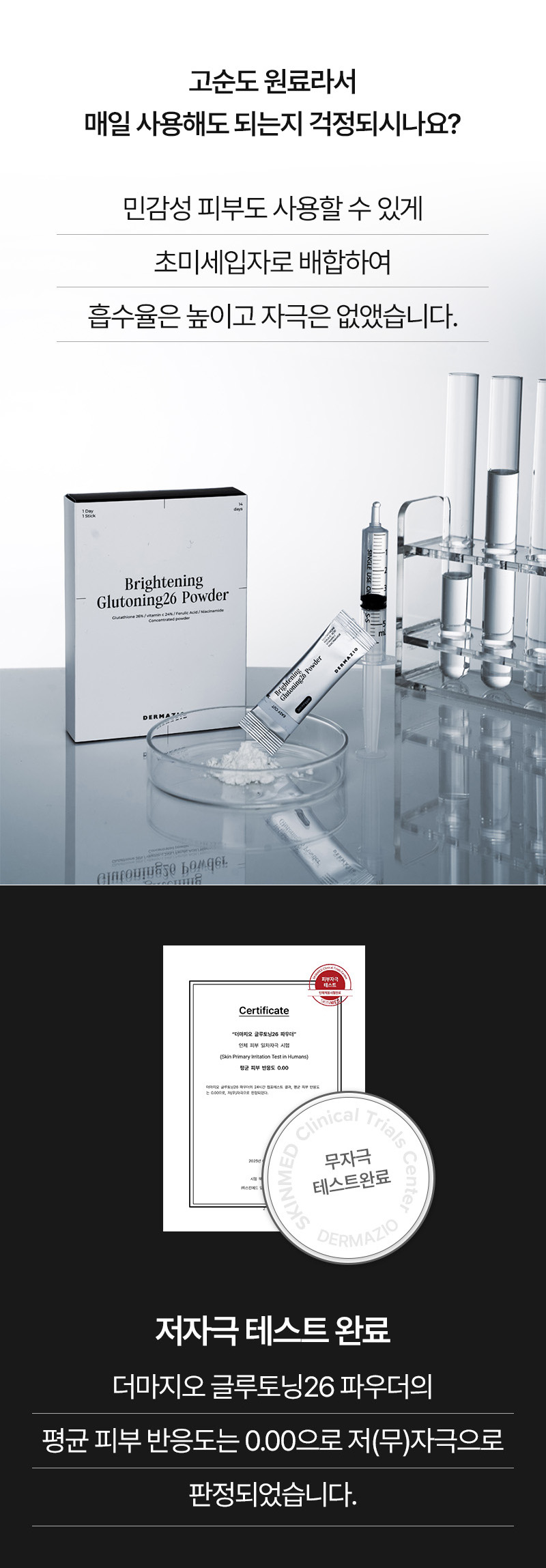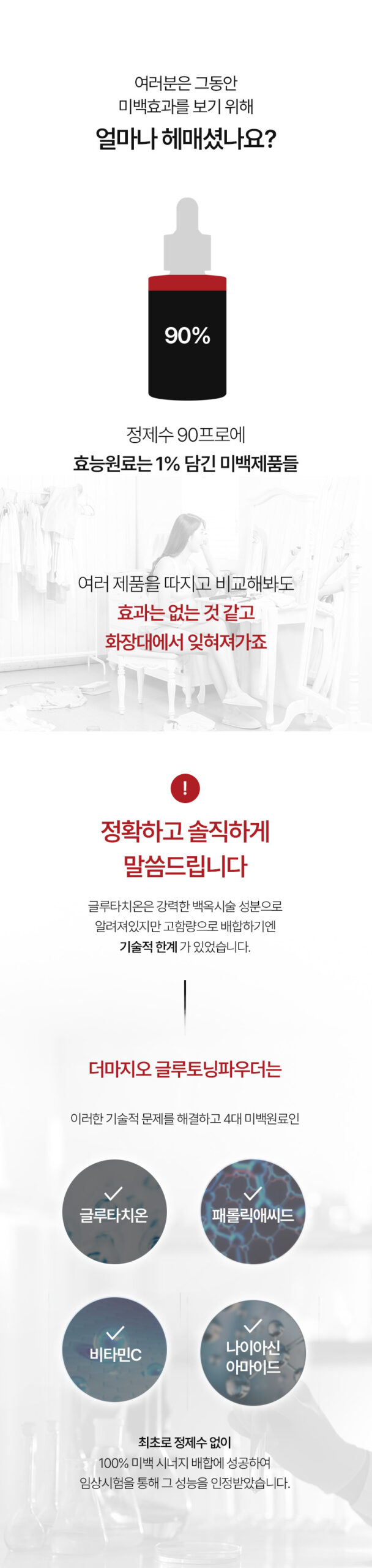 With consistent nighttime home care, DERMAZIO Glutoning 26 Powder helps suppress melanin production and restore natural skin radiance. Free from purified water and unnecessary additives, it blends only effective brightening ingredients: