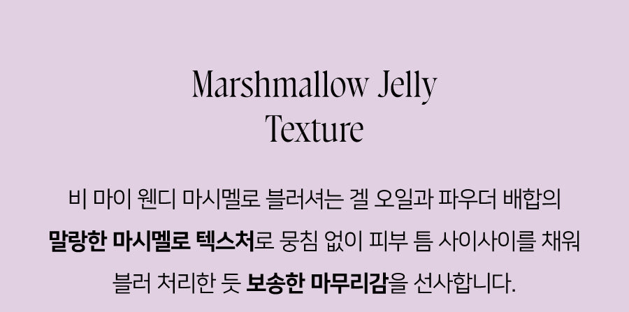 A velvety jelly texture combining gel oil and powder for a light yet breathable finish, leaving a soft, blurred look without clogging pores.