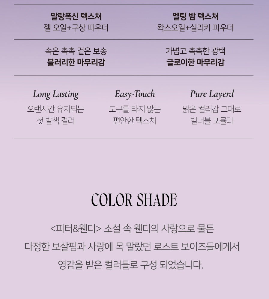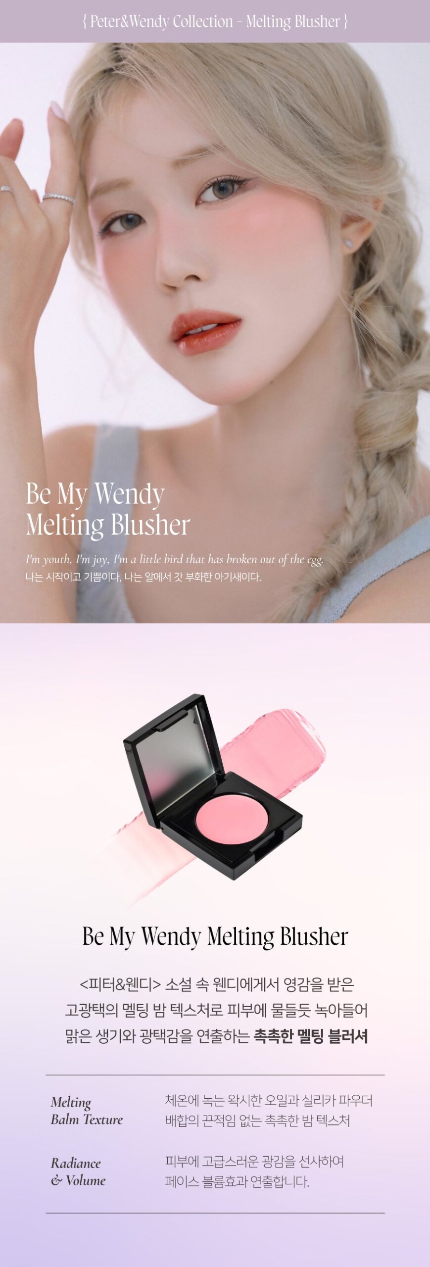 Inspired by Wendy, the beloved heroine from Peter and Wendy, the Be My Wendy Blusher line brings a touch of charm and color to your cheeks, just like the lost boys adored by Wendy’s love. Available in two captivating textures—Marshmallow and Melting—this blush collection promises a smooth, effortless application with long-lasting color that enhances your natural glow.