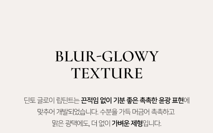 Experience a non-sticky, glass-like shine with the Dinto Blur Glowy Lip Tint. This innovative lip tint creates voluminous, pretty lips with a refreshing and lively look. Inspired by a newly planned summer waltz, the collection includes 10 vibrant colors.