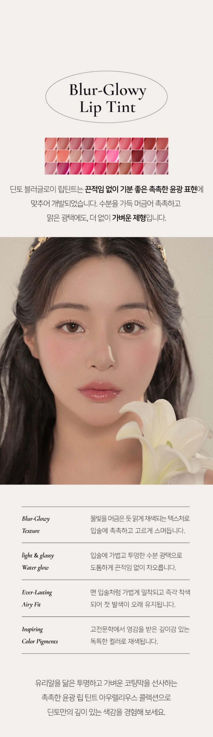 Experience a non-sticky, glass-like shine with the Dinto Blur Glowy Lip Tint. This innovative lip tint creates voluminous, pretty lips with a refreshing and lively look. Inspired by a newly planned summer waltz, the collection includes 10 vibrant colors.
