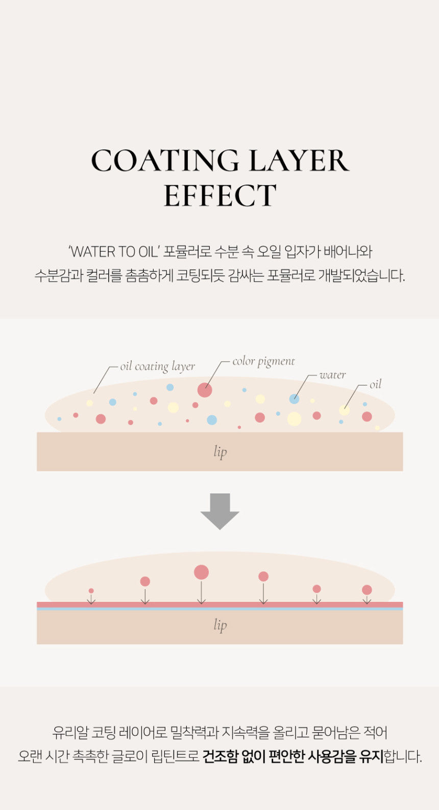 Developed with a water-to-oil formula, the moisturizing oil particles tightly coat the lips, providing both moisture and color. This unique combination delivers clear gloss and a light, non-sticky shine.