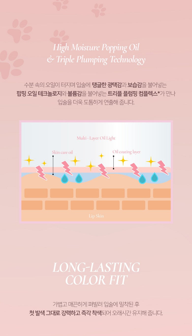 The innovative popping oil technology releases hydrating oils upon application, locking in moisture for a lasting gloss. Combined with the Triple Plumping Complex, this blend leaves lips looking plush and radiant.