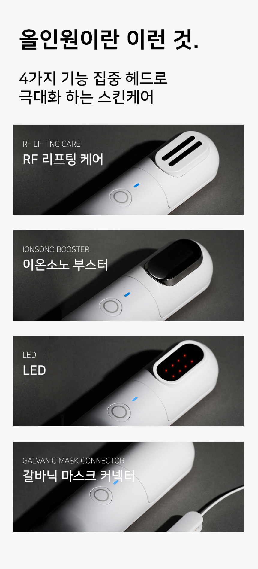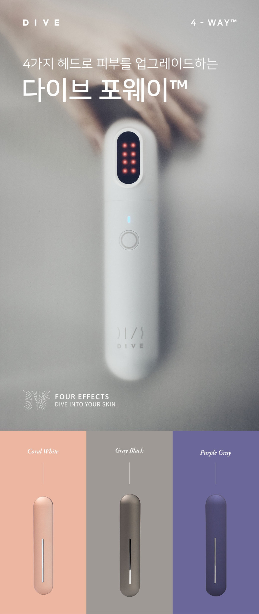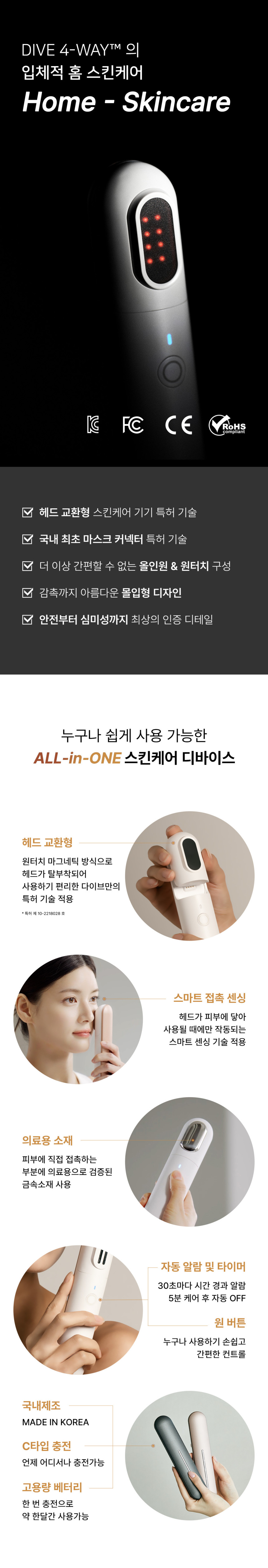 The DIVE 4-way Beauty Device features a patented system for easily swapping heads using a one-touch magnetic attachment, offering ultimate convenience in your skincare routine. This patented technology also includes the first-of-its-kind mask connector in Korea.