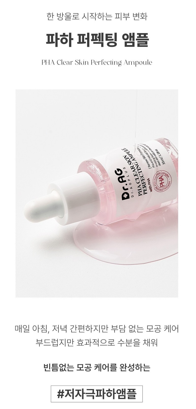 Achieve clearer, more radiant skin with Dr.AG PHA Clear Skin Perfecting Ampoule. This gentle yet effective serum features PHA (Polyhydroxy Acid) combined with natural AHA to promote cell turnover and exfoliate dead skin cells, revealing a brighter, smoother complexion without irritation.