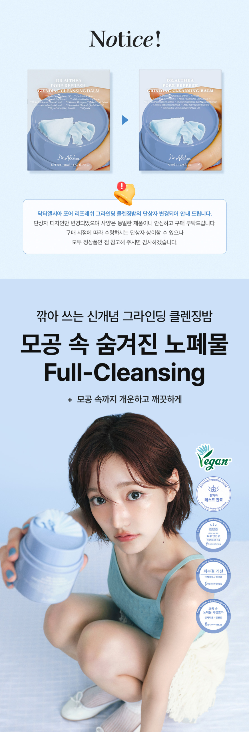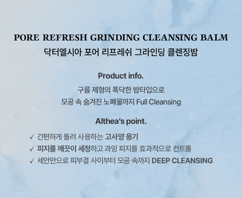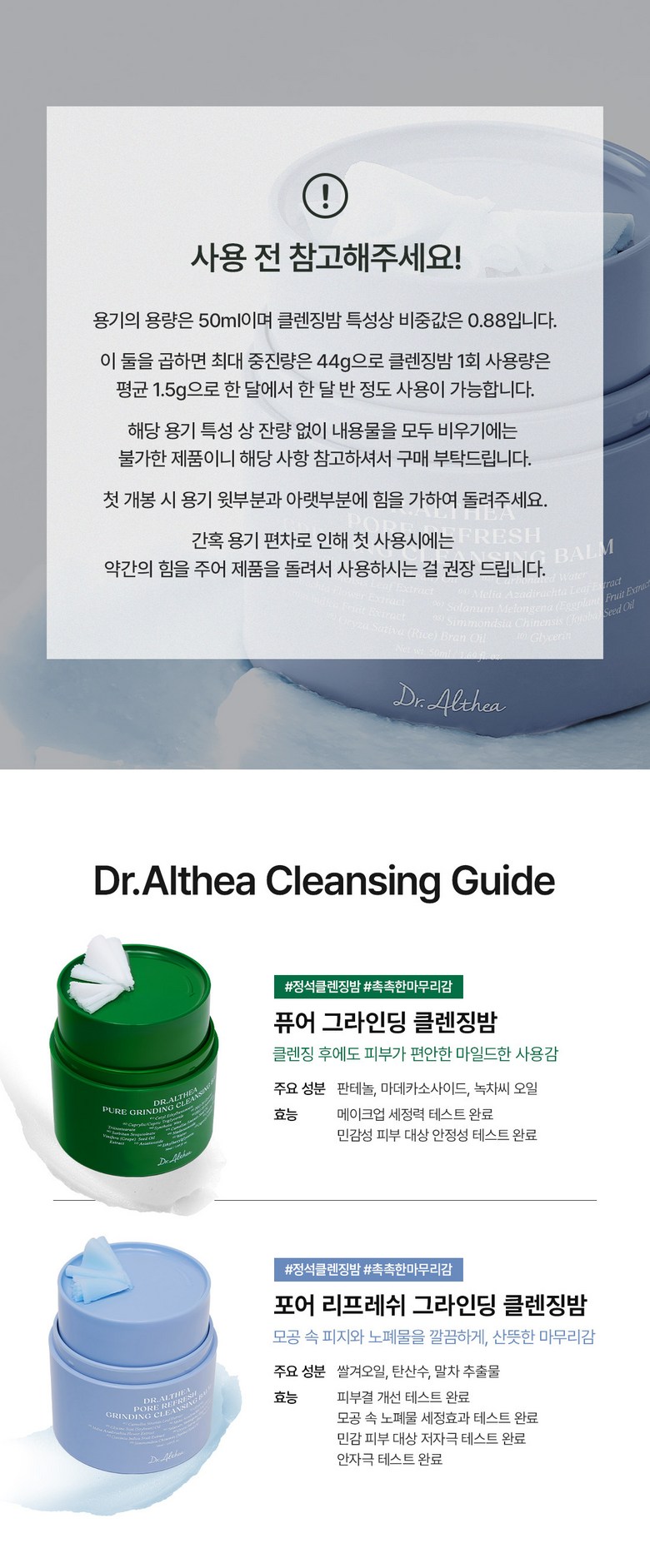 Introducing the innovative Dr. Althea Pore Refresh Grinding Cleansing Balm, a new concept in daily skincare designed to transform your cleansing routine. This unique grinding balm goes beyond surface cleaning, meticulously removing hidden impurities, makeup, and environmental pollutants from deep within your pores. Experience a refreshing, thorough cleanse that leaves your skin feeling exceptionally clean, soft, and perfectly balanced.