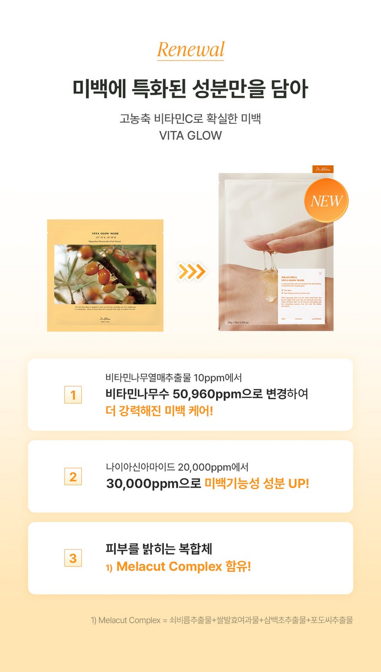 At the heart of our Vita Glow Mask is a remarkable concentration of 50,960ppm Hippophae Rhamnoides Water (Sea Buckthorn Water). This natural powerhouse is bursting with Vitamin C and a wealth of other essential nutrients, working synergistically to: