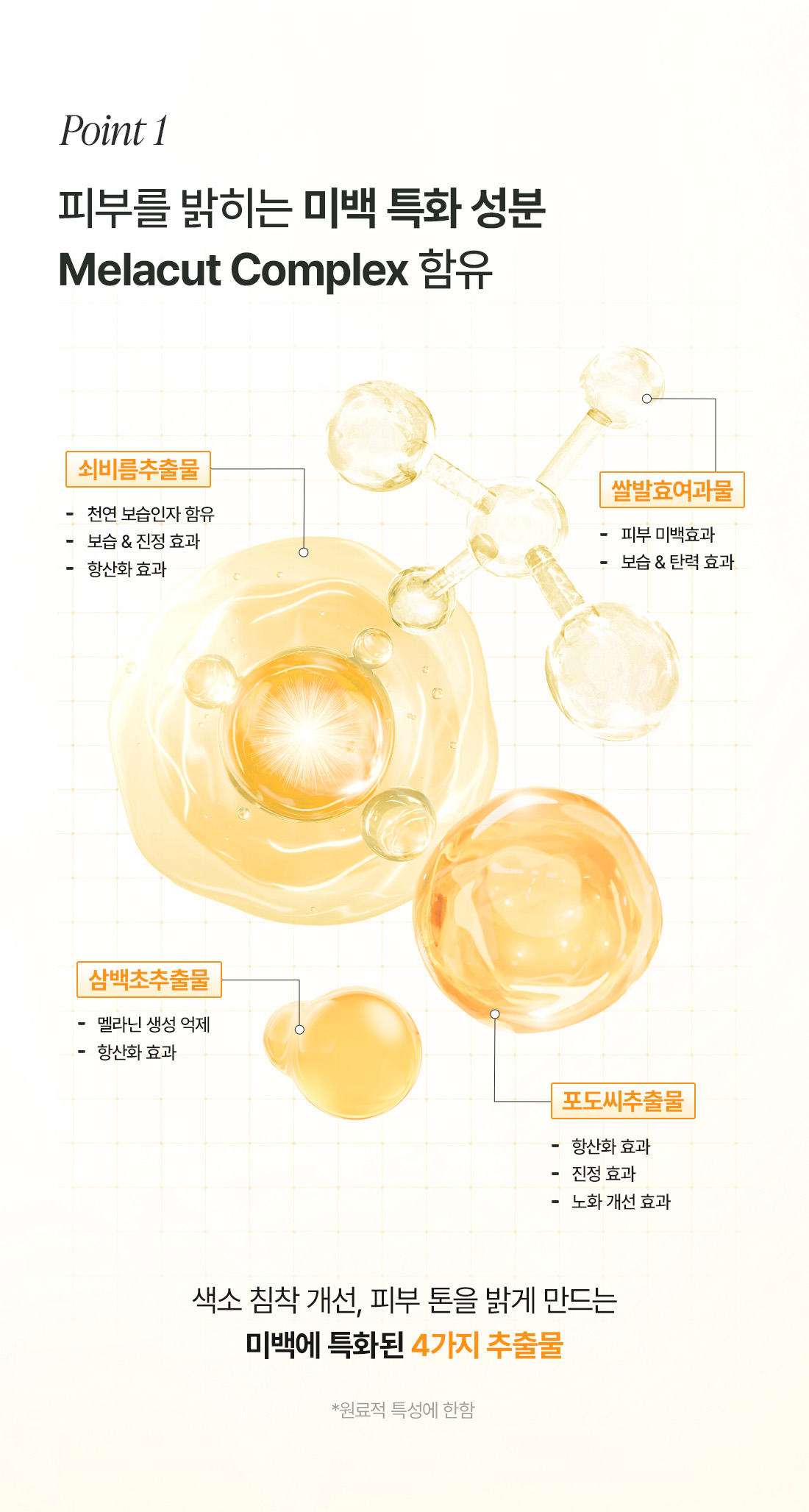 Our exclusive Melacut Complex is a proprietary blend of four specialized extracts, meticulously chosen to revive dull skin and deliver essential nutrients for a truly healthy glow. This complex is dedicated to improving pigmentation and brightening skin tone. (*Based on raw material properties)
