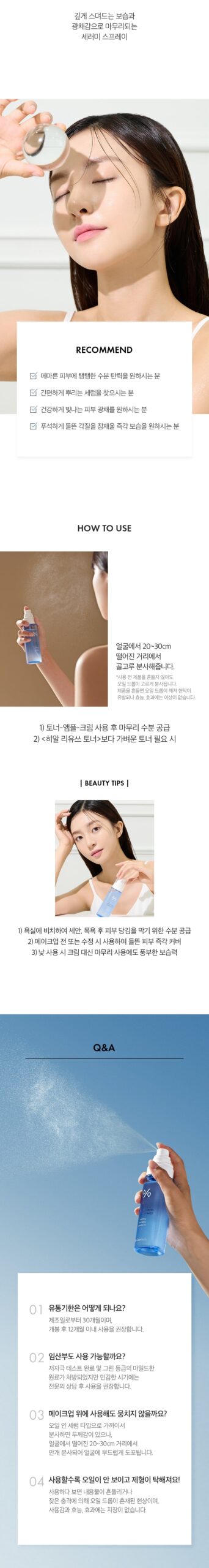 Spray the mist evenly from a distance of 20-30 cm from the face. Ideal for use after toner, ampoule, or as a finishing moisture touch post-cream application.