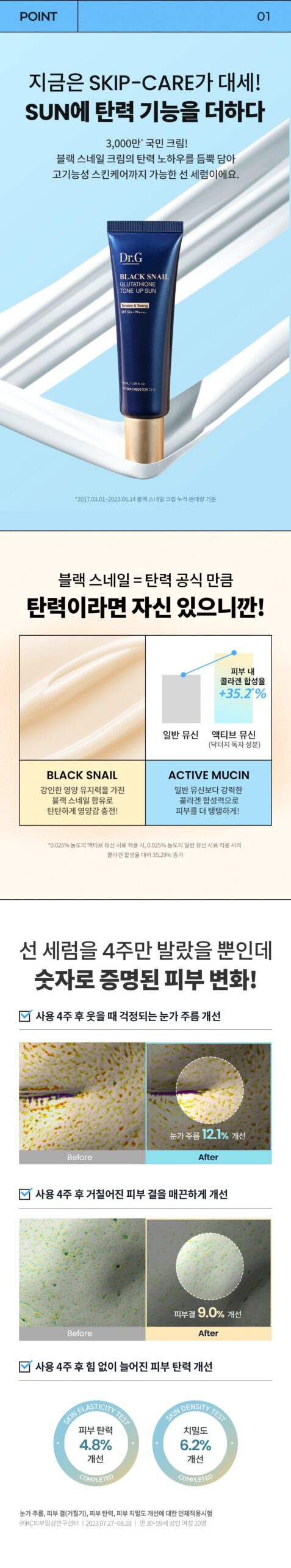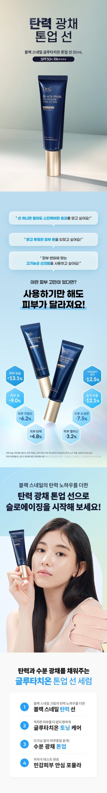 Indulge in the luxury of Dr.G Black Snail Glutathione Tone Up Sun and step into the light with confidence, enjoying protected, vibrant, and elastic skin day after day.