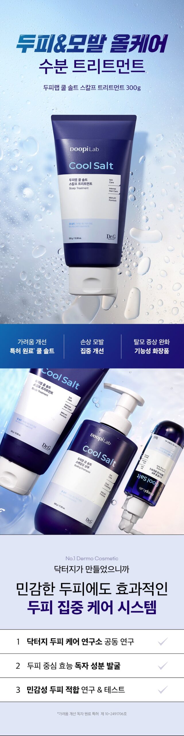 The Dr.G Doopi Lab Cool Salt Scalp Treatment is an all-care moisturizing treatment designed for both scalp and hair. Developed through comprehensive research with the Dr.G Scalp Care Institute, it incorporates a unique, patented ingredient specifically formulated to care for sensitive scalps. The product underwent thorough testing to ensure it alleviates scalp itchiness, reduces irritation, improves hair tangling, and leaves hair feeling soft and moisturized. Users consistently report cleaner scalps with reduced itchiness and appreciate that this treatment benefits both the scalp and hair.
