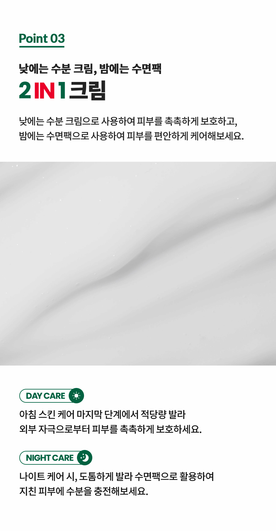 Use it as a moisturizing cream during the day to moisturize and protect your skin, and use it as a sleeping pack at night to take care of your skin comfortably.