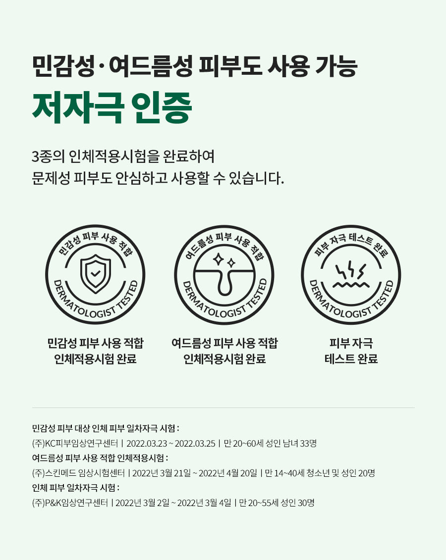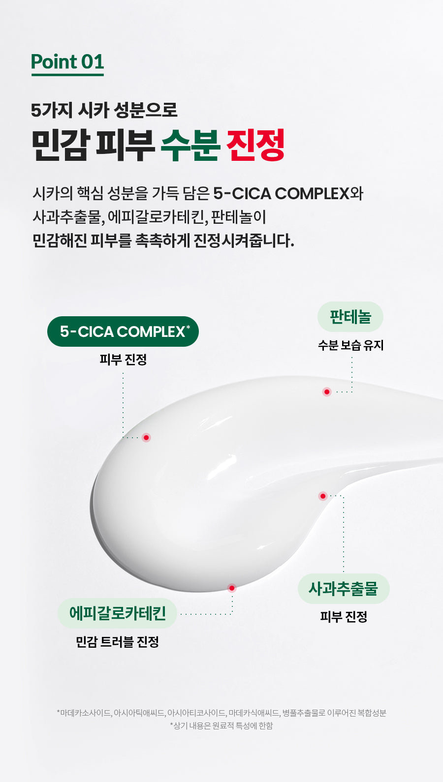 5-CICA COMPLEX, which is full of Cica’s core ingredients, and apple extract, epigallocatechin, and panthenol moisturize and soothe sensitive skin.