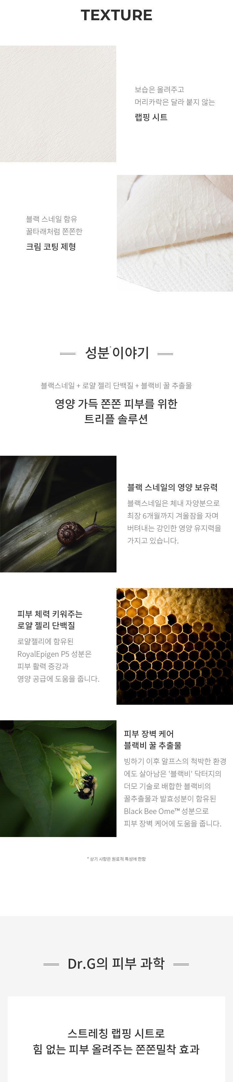 | Keywords | Dr.G, Royal Black Snail, Cream Mask, Nourishing Mask, Skin Lifting, Elastic Skin, Skincare, Moisturizing Mask, Anti-aging, Korean Skincare, Facial Mask, Sheet Mask, Royal Jelly, Black Bee Propolis |