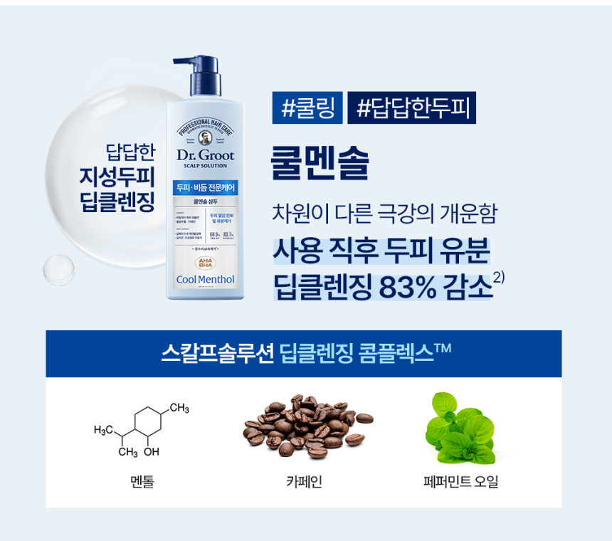 Dr. Groot Scalp Solution Cool Menthol Shampoo is expertly formulated to target dandruff and scalp concerns using patented active ingredients approved by the Korea Food and Drug Administration (KFDA). Enriched with AHA, BHA, and Climbazole, this shampoo provides enhanced dandruff care and promotes a healthy scalp.