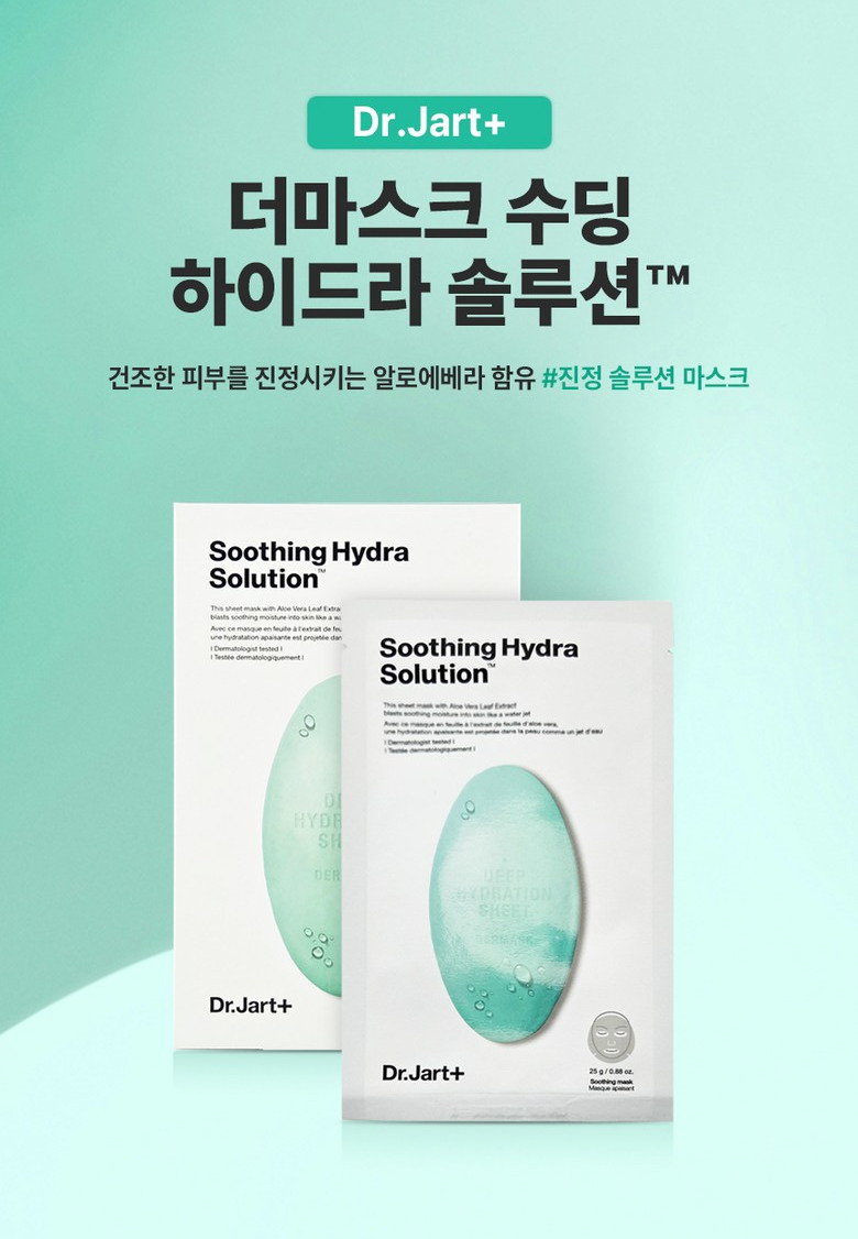 The DR. JART+ Dermask Water Jet Soothing Hydra Solution Sheet Mask is a cellulose sheet mask that hydrates, soothes, and calms sensitive and dehydrated skin. Made of fine cellulose fiber, the lightweight, transparent mask allows your skin to fully absorb essential nutrients and moisturising ingredients for the ultimate hydration therapy. The comforting complex derived from botanical extracts—including aloe vera and phytoncides—provide cooling relief to soothe redness, blemishes, and sun burns and keep skin looking and feeling calm and refreshed.