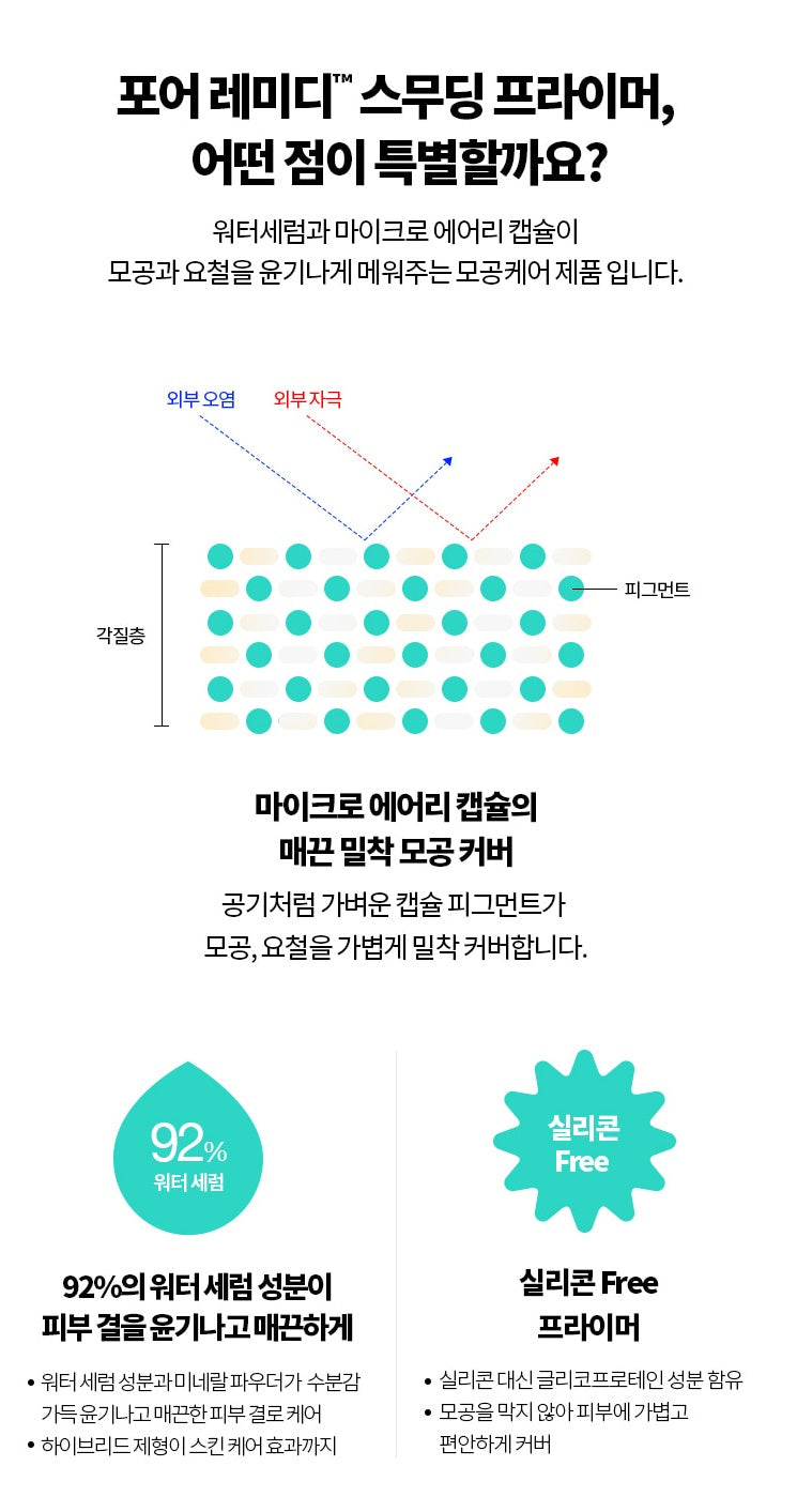 A close-fitting cover primer that fills pores and bumps with water serum and micro airy capsules.