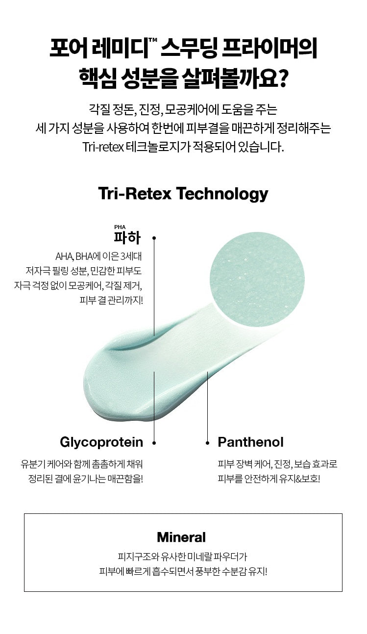 Tri-retex technology is applied that smoothes the skin texture at once by using three ingredients that help to remove dead skin cells, soothe, and care for pores.