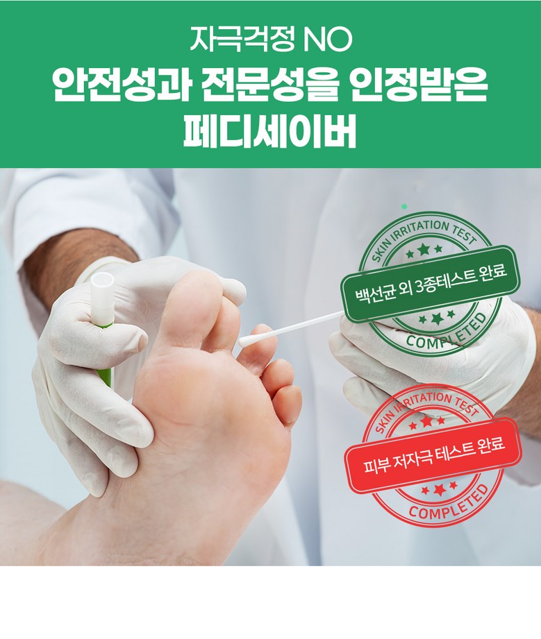 Pedisaver’s effectiveness in suppressing harmful bacteria has also been proven through tests by professional organizations. In a test for harmful bacteria conducted by the Korea Analytical Testing Research Institute KATR, Pedi Saver showed 99.999% sterilization and inhibition power against not only Staphylococcus aureus, Escherichia coli, and Pseudomonas aeruginosa, but also Ringworm, a known cause of athlete’s foot. It can be used with confidence as it has been recognized as safe in skin hypoallergenic tests.