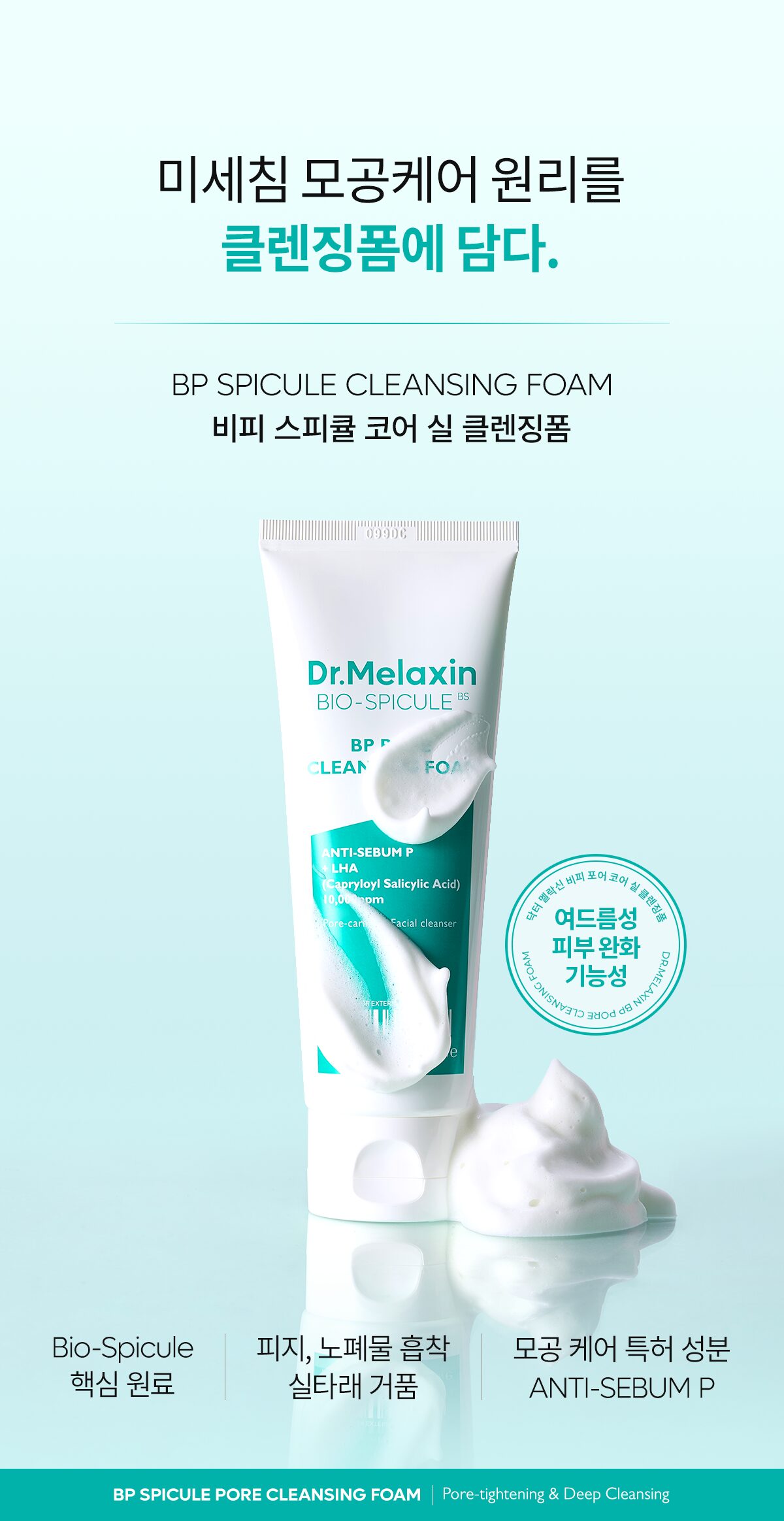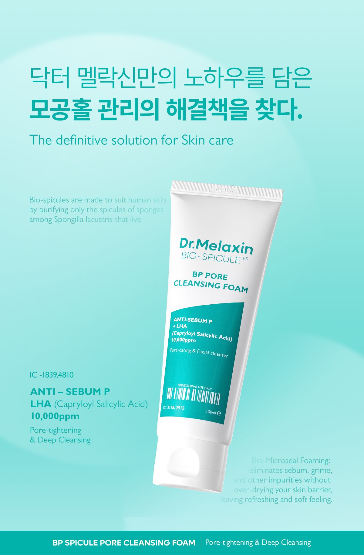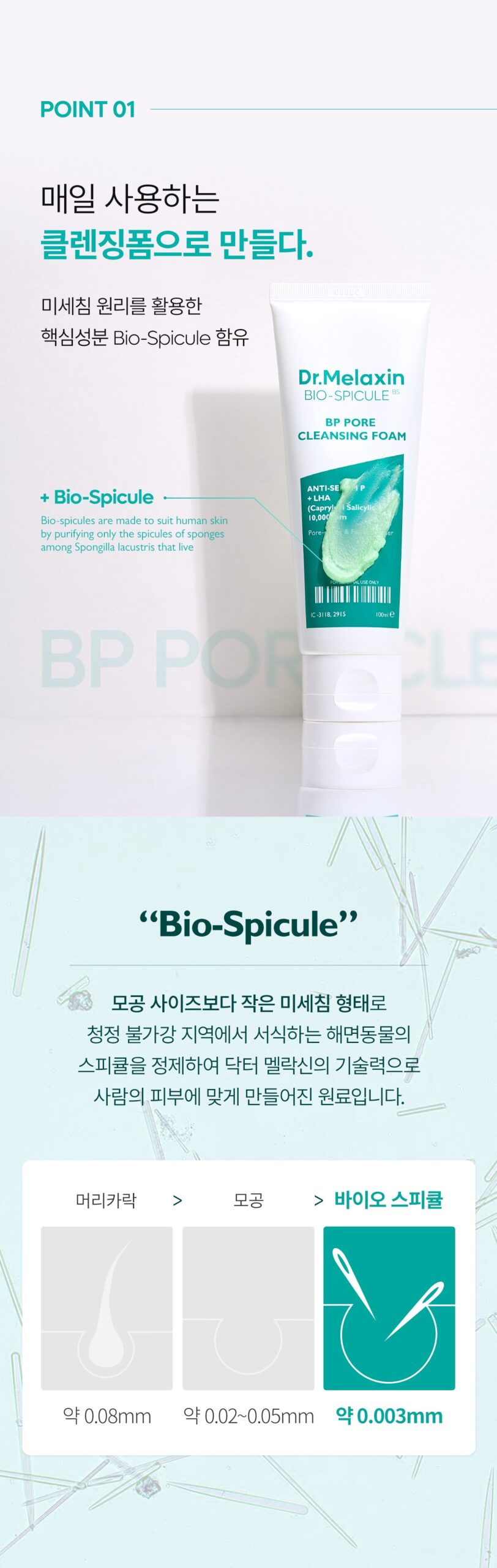 Dr. Melaxin BP Pore Cleansing Foam incorporates the innovative Bio-Spicule, a refined micro-needle derived from sponge organisms inhabiting pristine areas. This micro-ingredient is specifically designed to fit human skin, deeply cleansing pores with precision and care.