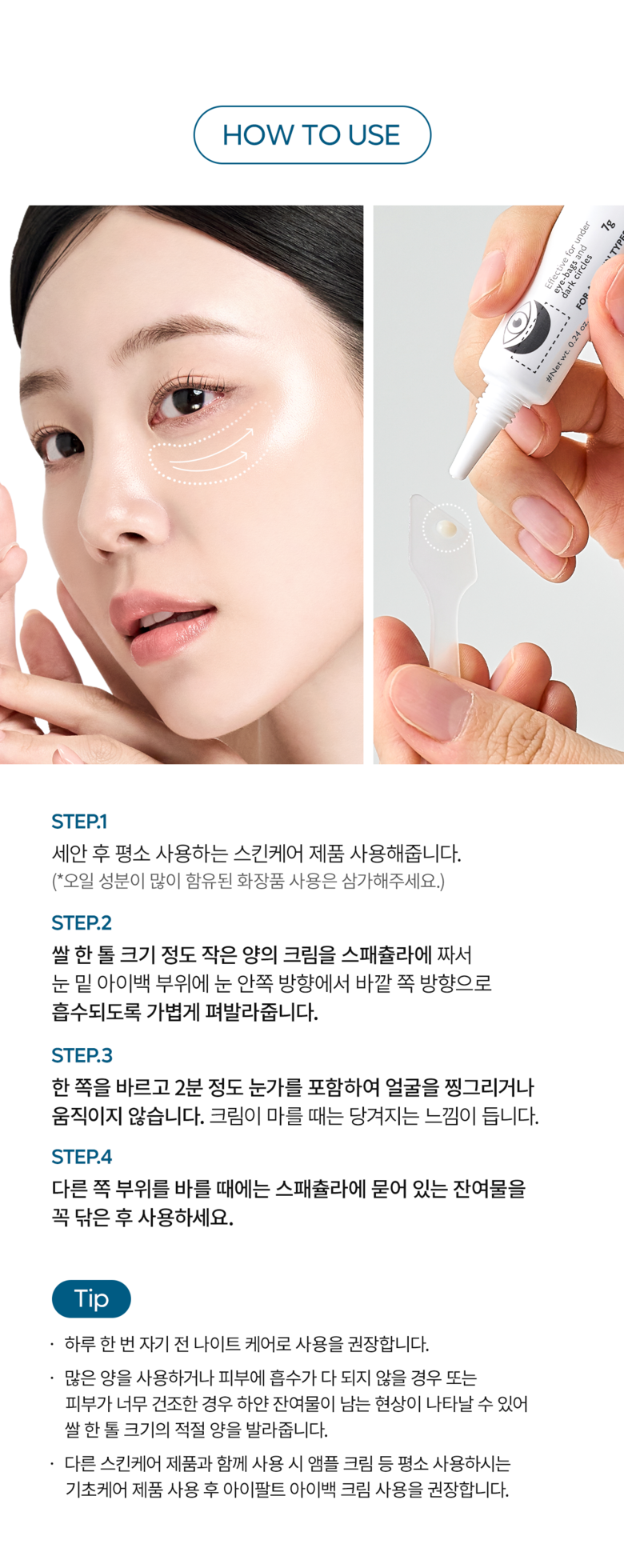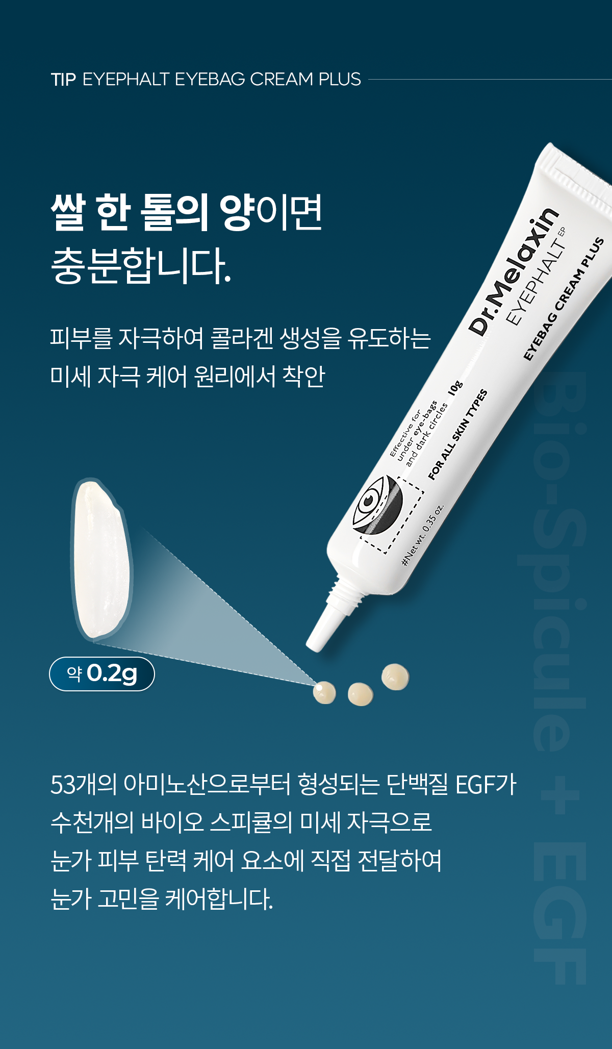 - Dispense a small, pea-sized amount of Dr.MELAXIN Eyephalt Eye Bag Cream Plus onto your ring finger.