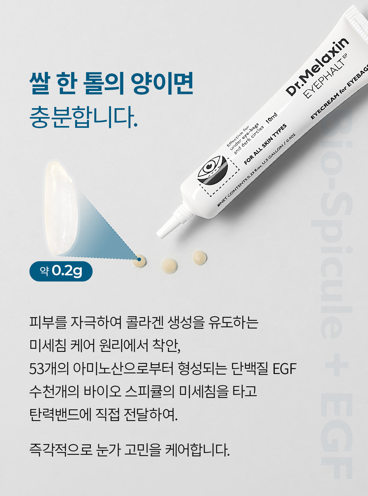 I was pleasantly surprised by the Dr. Melaxin Eyephalt Eye Cream. The key feature of EGF Spicule really stands out, as it significantly boosted my under-eye elasticity after just a few uses. I noticed a remarkable improvement in eye bag volume and fine lines; the results are visible almost instantly! This product not only tackled my dark circles effectively but also left my skin feeling firmer and rejuvenated without any irritation, which is impressive for sensitive skin like mine.