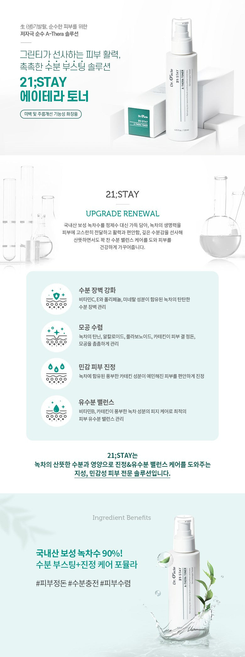 Experience the revitalizing benefits of the 21;STAY A-Thera Toner, a specialized solution designed for oily and sensitive skin. This toner replaces purified water with 90% domestic Boseong green tea water, delivering the vitality of green tea directly to your skin. It provides comfort, deep hydration, and helps maintain a fresh and balanced moisture level for healthy, vibrant skin.