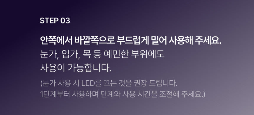 Move the device from the inside of the face outward, focusing on sensitive areas like the eyes, mouth, and neck. For eye care, it’s recommended to turn off the LED light and start with Step 1, adjusting as needed. -