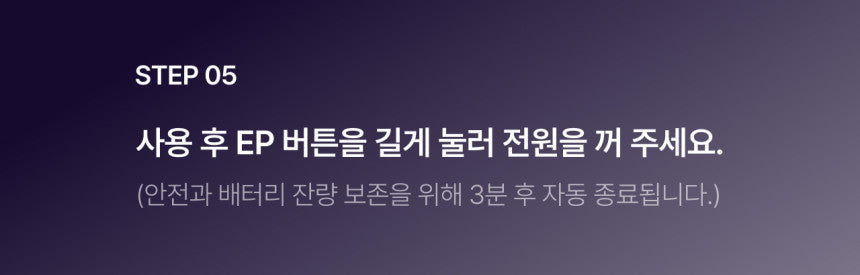 Press and hold the EP button to turn off the device manually, or it will automatically power down after 3 minutes to conserve battery.