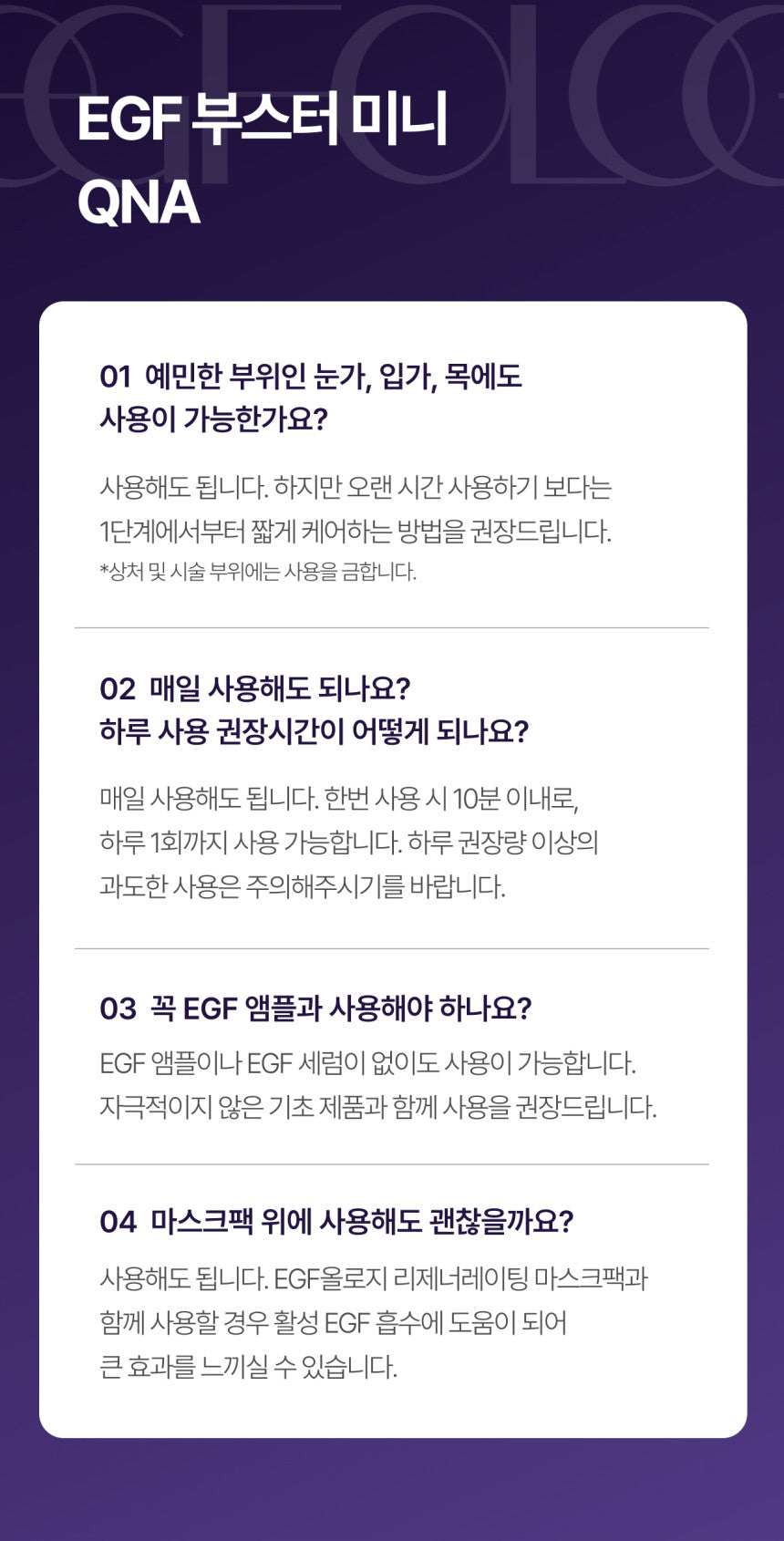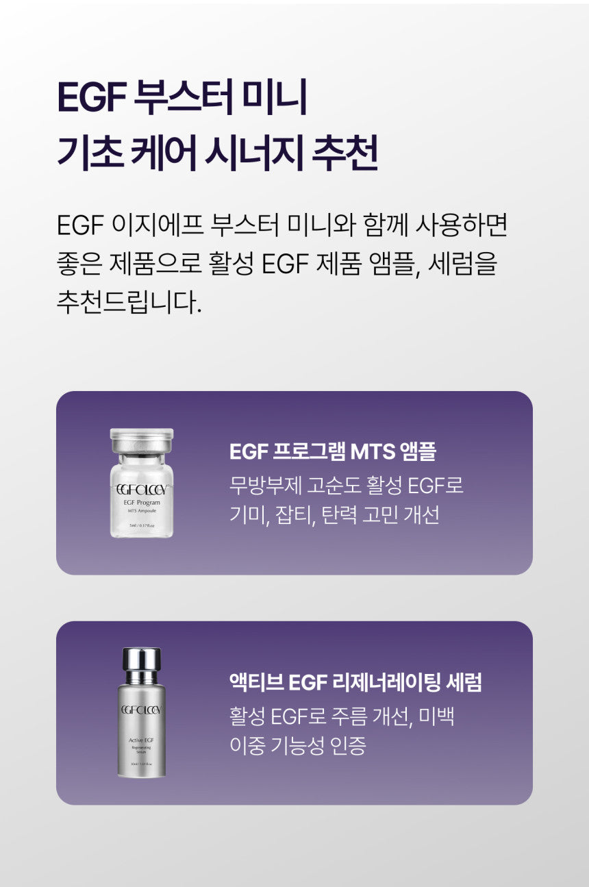 - Compatibility with Mask Packs: Use the EGF Booster Mini over a mask pack, such as the EGF Ology Regenerating Mask Pack, to amplify the absorption and effectiveness of active EGF ingredients.