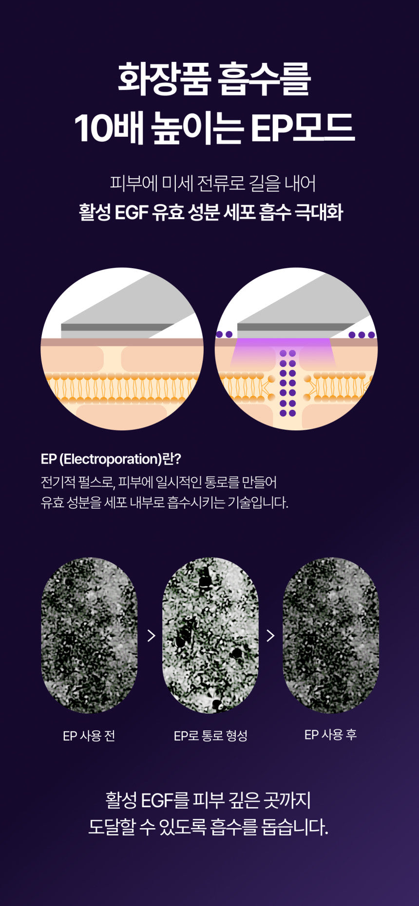 EP technology uses tiny electrical pulses to create a temporary passage through the skin layers, allowing key ingredients to reach deeper into the skin. This advanced technology ensures that active EGF components are delivered directly to where they’re needed most.