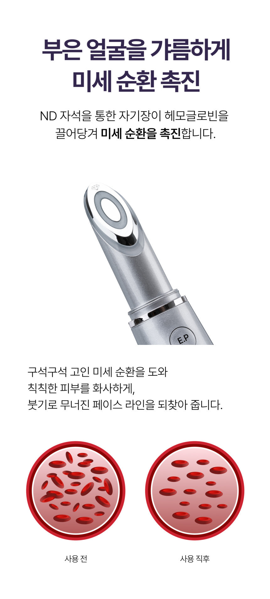 Promote microcirculation to reduce puffiness and restore a sculpted facial contour. The ND magnet within the device stimulates hemoglobin movement, enhancing blood flow for a revitalized, brighter skin tone. This feature helps diminish facial puffiness, bringing out a more defined face line.