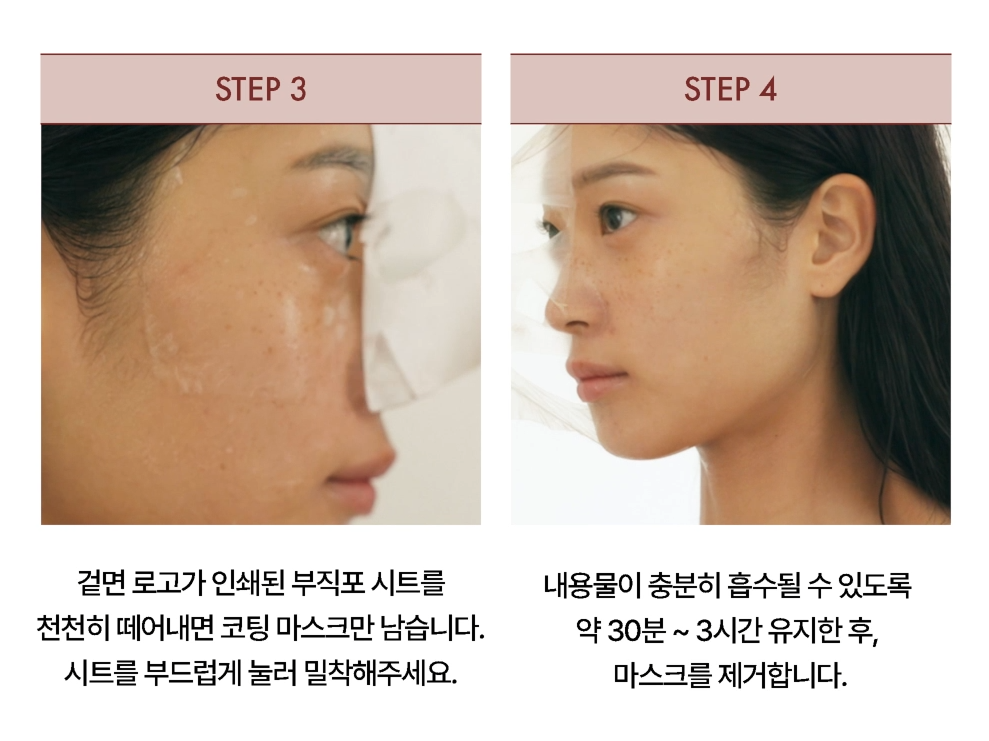 Peel off the outer non-woven sheet with the logo, leaving the thin collagen-coated mask on your skin. Gently press for full adherence.