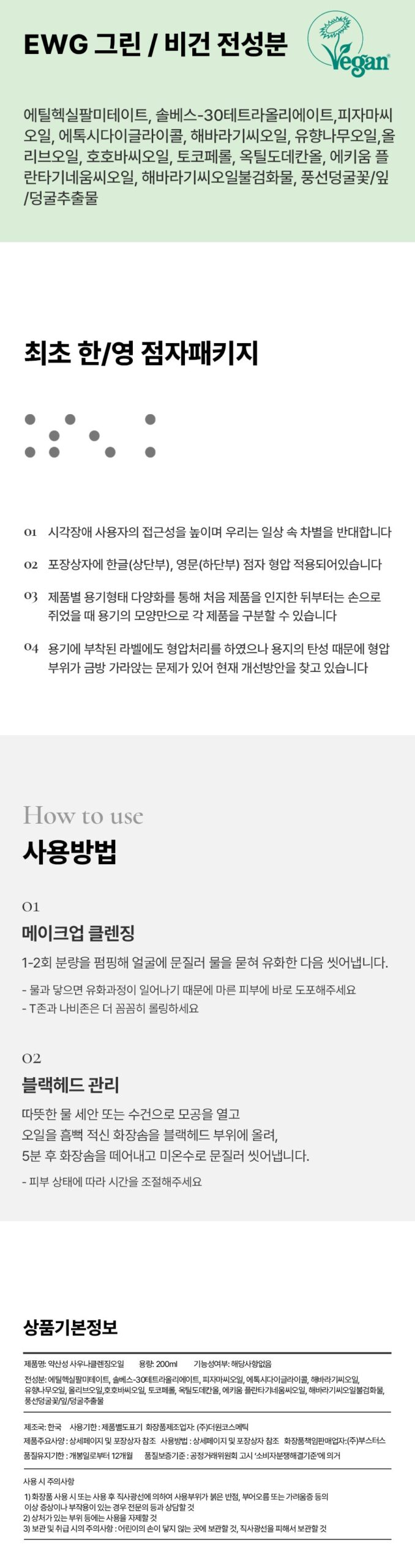 Blackhead Care: Open your pores with warm water or a towel, then apply a cotton pad soaked in the oil to the blackhead area. After 5 minutes, remove the cotton pad and rinse with lukewarm water. Adjust time according to your skin’s needs.