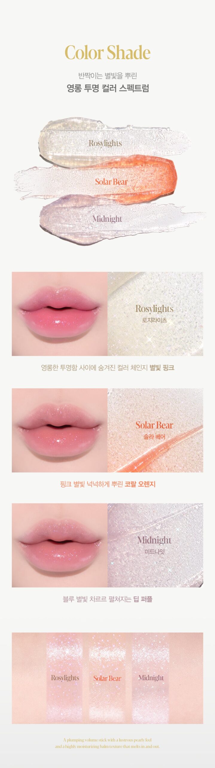 Experience the Transparent Coloring Plumping Stick, a high-moisture balm infused with stunning starlight pearl particles. This plumping balm creates a luminous, rosy glow while delivering hydration and a soft, jelly-like texture for a truly comfortable feel.